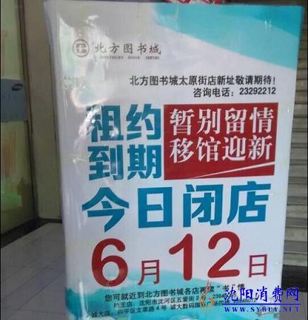 沈阳消费网讯,近日位于太原街中华路的北方图书城太原街店已经关闭。该店现在门前挂出公告,因为租约到期,将搬迁到新址,但是没有公告新店地址,这样,太原街地区就又少了一个看书和购书的地方。