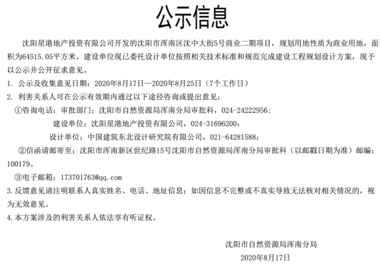 沈阳星港地产投资有限公司开发的沈阳市浑南区沈中大街5号商业二期项目,规划用地性质为商业用地,面积为64515.05平方米。建设单位现已委托设计单位按照相关技术标准和规范完成建设工程规划设计方案,现予以公示并公开征求意见。