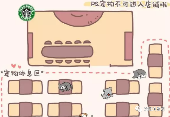 星巴克打造的宠物友好店,在门店外摆的位置设立专门的宠物休息区,宠物不可以进店,这样爱宠人士拥有一个独立的休息空间,而普通顾客在门店内消费又可以不被打扰。