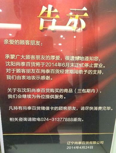 沈阳消费网网友提供信息,沈阳尚泰百货已经正式贴出6月末停业的公告。根据沈阳消费网整理和收集到信息,尚泰百货闭店后,原址可能会进驻部分餐饮品牌。至于尚泰百货独有一些品牌是否能留在万象城还是转到沈阳其他百货,消费网将密切关注。