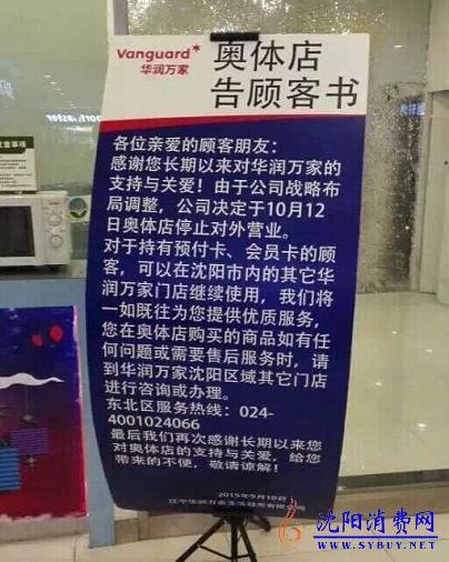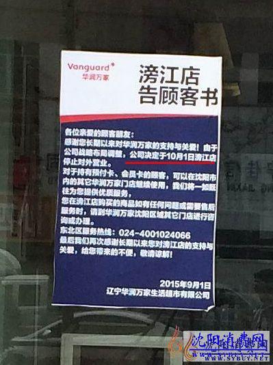 沈阳消费网讯,华润万家公告将在10月关闭两家沈阳门店,这两家门店分别是位于浑南区的华润万家奥体万达超市和位于大东区滂江街的华润万家滂江店,关闭时间将分别于10月12日和10月1日。(详见下图)
