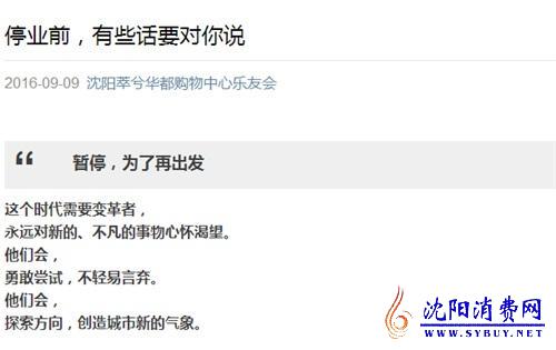 沈阳消费网之前报道过的韩国衣恋优客城市广场将进驻萃兮华都的消息昨天证实。萃兮华都昨天官方微信发布了一条“停业前,有些话要对你说”消息,正式宣布将停业,并与韩国衣恋联手打造沈阳首个City Mall城市广场。