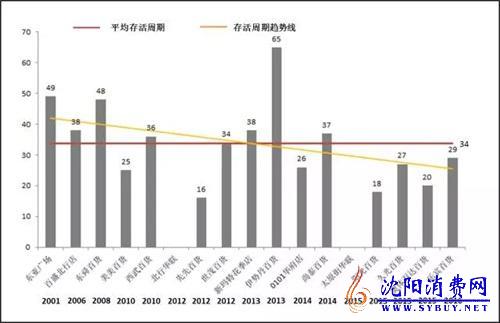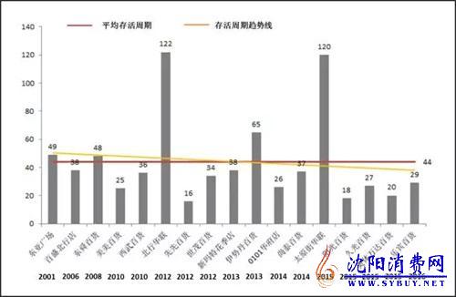 据统计,在接连闭店的17家百货中,北行华联店的存活周期最长为122个月,大悦城的先先百货存活周期最短仅为16个月。这些百货的平均存活周期为44个月,如果除去北行华联店,太原街华联店,15家百货的平均存活周期仅为34个月,并且从趋势图来看,沈阳的百货商店存活周期呈现下降趋势。