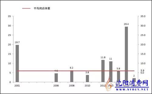 从体量上来讲,2001年至今,沈阳关掉的百货体量高达94.3万平,平均每年关掉5.9万平。