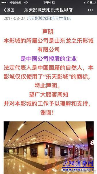 沈阳消费网网友爆料,昨日,乐天影城沈阳乐天世界店发布声明,该影城所属公司为山东龙之乐影城有限公司,是中国公司控股的企业,仅为使用乐天影城商标。