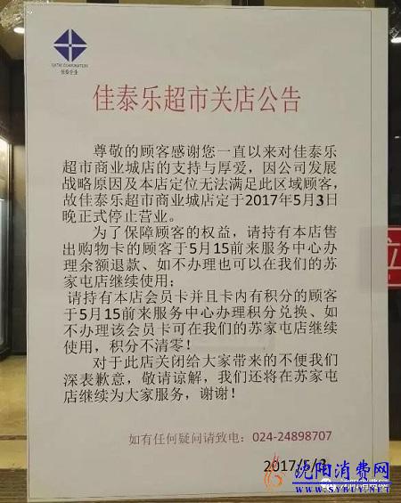 沈阳消费网讯,位于中街商业城地下一层的佳泰乐超市商业城店近期闭店,目前超市已经关闭,门前贴着闭店公告:
