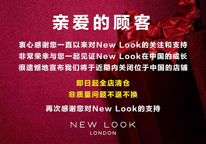 据NEWLOOK官方微博宣布,“近期内关闭位于中国的店铺”。这意味着,这家英国服饰品牌正式宣布退出中国市场。![]() NEWLOOK在其官方微博公布:“衷心感谢您一直以来对NewLook的关注和支持,非常荣幸与您一起见证NewLook在中国的成长。很遗憾地宣布,我们将于近期内关闭位于中国的店铺。即日起全店清仓,非质量问题不退不换”。 ![]() NewLook方面称,此次关店涉及中国市场的120家门店,将于今年内全部关闭,预计将会有730名员工面临失业。据了解,不少地方的NEWLOOK门店都11月就已经开始了清仓大甩卖,甚至NEWLOOK部分门店已经关门,其他还在营业的门店折扣力度非常大,部分门店折扣3折起。 NEWLOOK在2014年首次进入中国,以每年30家的开店速度迅速扩张,至2016年中国门店已经突破100家。NEWLOOK曾提出“三年开500家门店”计划。至今年年中,NewLook宣布终止品牌在中国的扩张,并表示已经在重新审视其在中国的发展战略,暂停开设500家实体门店的计划。
