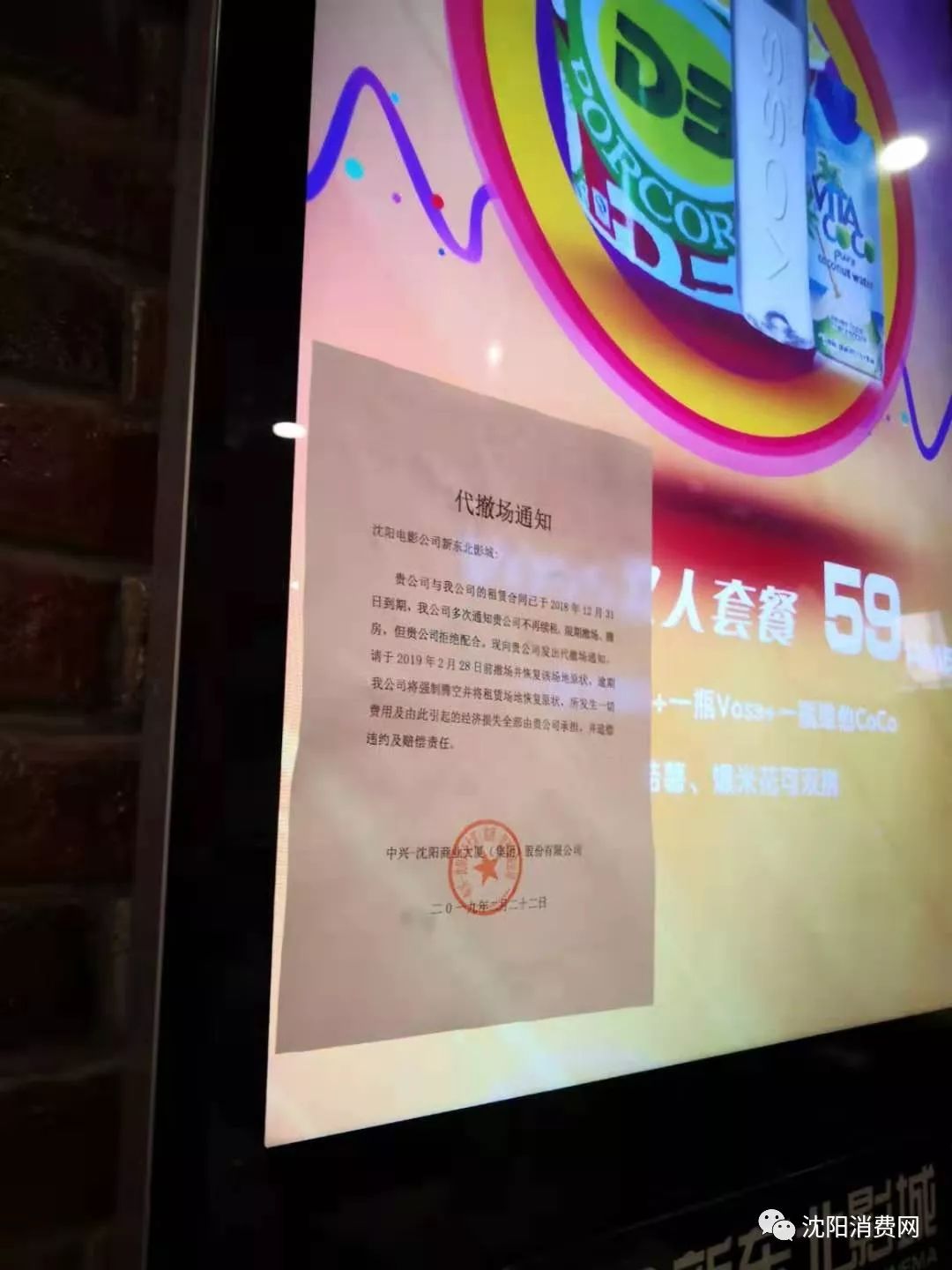 沈阳消费网网友爆料并提供图片,位于太原街中兴的新东北影城(中兴店)或将撤离,根据图片上公告,合同截止于去年底,也就是说未来该影院或将撤离。