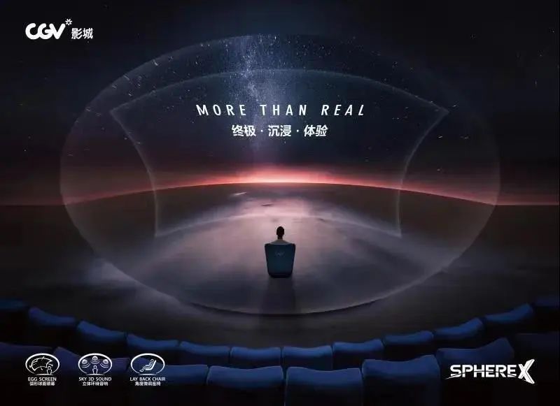 它打破传统方形影厅的固有模式 打造划时代的弧形沉浸式电影体验馆 Sphere X并不是特定领域的技术采用 而是指3S Screen, Seat, Sound 技术上的复合性结合与进化而成的空间 由Curved Screen 提供的最大程度投入感 及由Tilting Seat 提供的最佳的观影视角 由Sky 3D sound组合及实现 最佳的立体音响效果 可以让人体验到 被整个上映厅环绕的感觉 提供最大程度的投入感