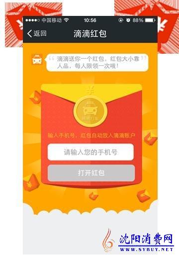 百万滴滴红包9月再次席卷沈阳,沈阳消费网请你打车! 滴滴打车现金红包全城免费派送,机会难得,数量有限哦!