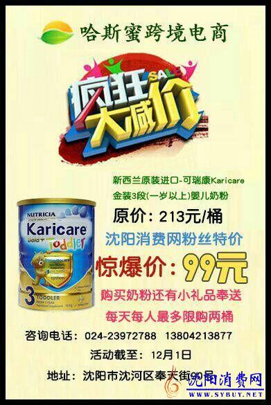 即日起,凡是关注消费网微信公众账号的好朋友,(包含已经关注过的),在我们微信平台上回复“奶粉”或者“哈斯蜜”(回复其中任一个均可),即可凭此微信以在沈阳哈斯蜜跨境电商线下体验店享受新西兰原装进口-可瑞康 Karicare 金装 3 段(1岁以上)婴儿奶粉,原价239元,粉丝特价99元/桶!!