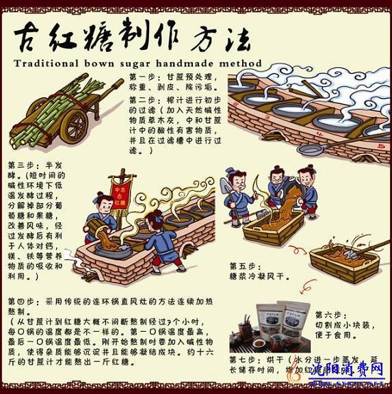 第一步:甘蔗预处理,称重、剥皮、除污垢。 第二步:榨汁进行初步的过滤(加入天然碱性物质草木灰,中和甘蔗汁中的酸性有害物质,并且在过滤槽中进行过滤。) 第三步:半发酵(短时间的碱性环境下低温发酵过程,分解掉部分葡萄糖和果糖,改善风味,经过发酵后有利于人体对钙,镁、铁等营养物质的吸收和利用) 第四步:采用传统的连环锅直风灶的方法连续加热熬制。 (从甘蔗汁到红糖大概不间断熬制经过7个小时,每口锅的温度都是不一样的。第一口锅温度最高,最后一口锅温度最低。刚开始熬制时要加入碱性物质,使得杂质能够沉淀并且能够凝结成块。约十六斤的甘蔗汁才能熬出一斤红糖。 第五步:糖浆冷凝风干。 第六步:切割成小块装,便于食用。 第七步:烘干(水分进一步蒸发,延长储存时间,增加红糖的风味。用料精良,万不敢一丝拙劣。