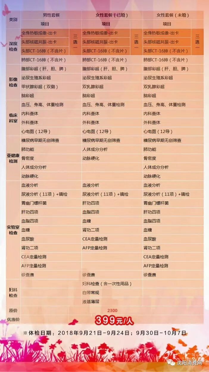美年大健康节日特惠,原价2323元消粉儿优惠399元,全身体检包括头核磁,肺ct,彩超,肿瘤筛查,妇科,乳腺,宫颈癌等,可用市医保卡。