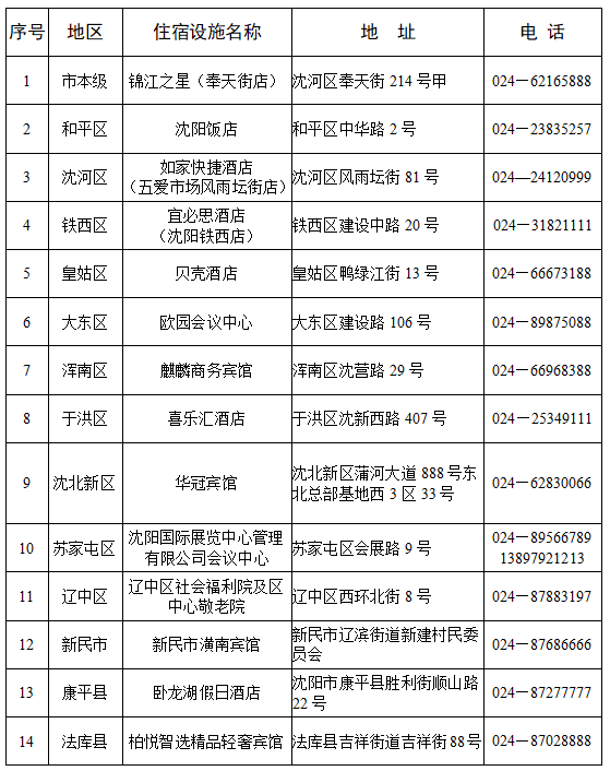 1月30日,记者从沈阳市文化旅游和广播电视局获悉,沈阳市新型冠状病毒感染的肺炎疫情防控工作指挥部决定,根据突发公共卫生事件一级响应机制要求,为妥善解决湖北省在沈旅客住宿安置问题,沈阳市及各区县(市)确定14家宾馆统一提供给来自湖北省的旅客集中住宿。