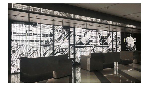 酒店大堂前台的背景墙 以1996年发行的《沈阳故宫》邮票为原形 采用镂空金属设计元素折射光影交错的视觉美感 以艺术的手法呈现出沈阳故宫全景鸟瞰图 打造出让人眼前一亮的记忆点