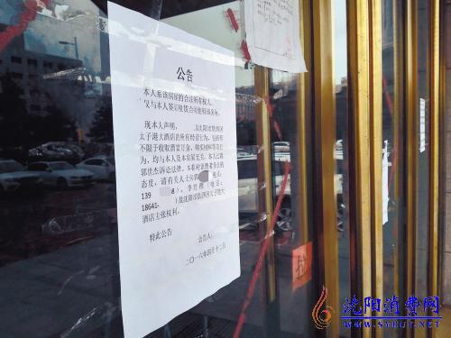 房主贴出告示 眼瞅要结婚,预定妥妥的酒店却突然停业,你说这得让人多闹心。4月17日,市民梁先生向沈阳晚报、沈阳网记者爆料,去年年底,他在铁西区太子港大酒店预定了婚宴,婚礼定在今年的6月份,可就在最近,在没有向消费者发出任何通知的前提下,酒店却突然关门,酒店相关联系人全都联系不上,5000元的定金也不知道向何处讨要。
