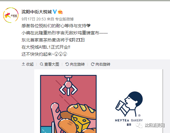 来自沈阳大悦城官方微博消息:东北首家喜茶热麦店将于9月21日在大悦城A馆L1正式开业