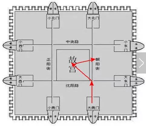 整体的思路就是 “四围、六路、四片区” 即东顺城、南顺城、西顺城、北顺城四条皇城边界; 即“三横三纵”景观路,即中街路、沈阳路、九门路“三横”,朝阳街、北通天街、正阳街“三纵”; 即建设以休闲娱乐为主的地载门(小北门)特色片区、以皇家文化博览为主的故宫特色片区、以民俗文化体验为主的天佑门(小南门)特色片区、以民国风情文化展示为主的帅府特色片区。