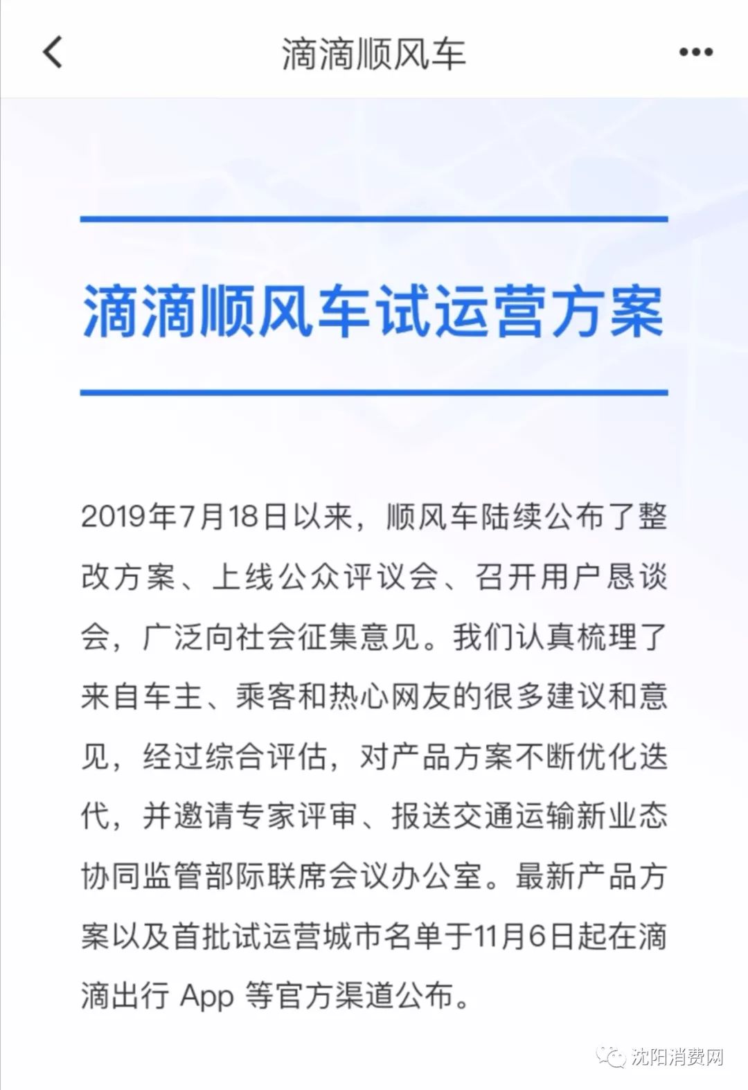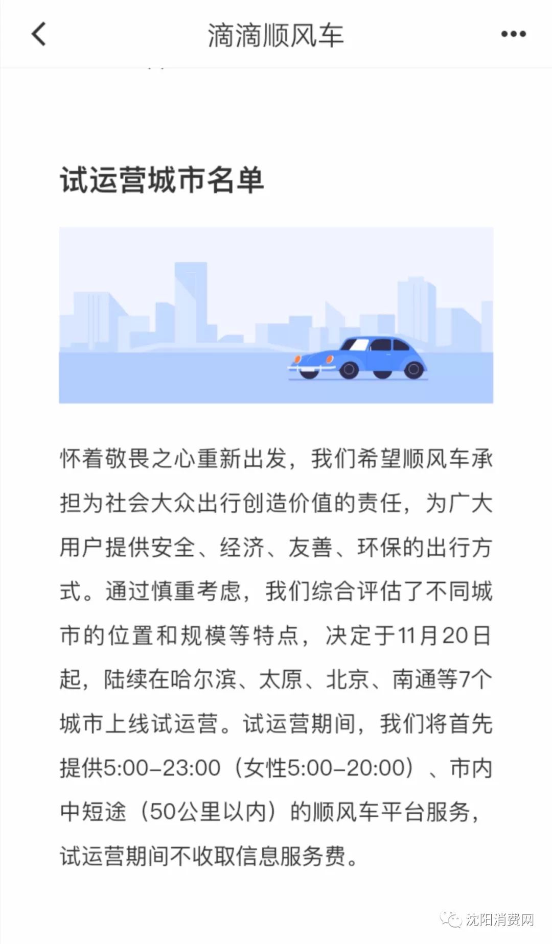 滴滴出行11月6日发布方案称,滴滴顺风车将于11月20日起,陆续在哈尔滨、太原、石家庄、常州、沈阳、北京、南通7个城市上线试运营。
