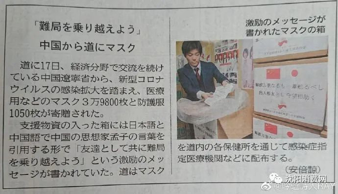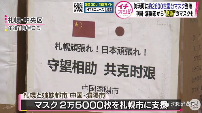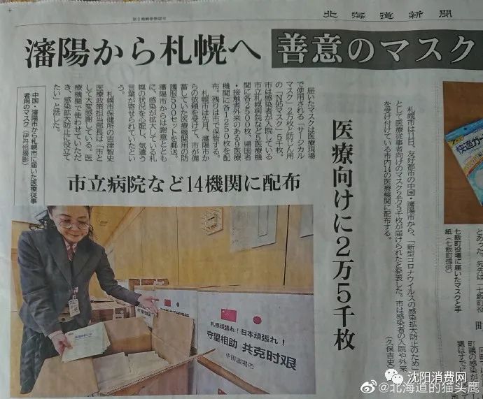 近日北海道电视台向全道播送了沈阳雪中送炭2.5万只口罩的事迹,这也是2月17日札幌向沈阳赠送防护服的“回礼”。
