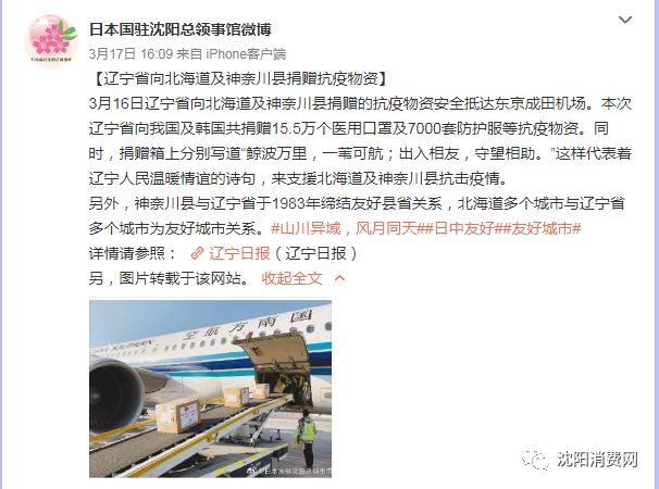 3月17日,日本国驻沈阳总领事馆微博也报道这件事:
