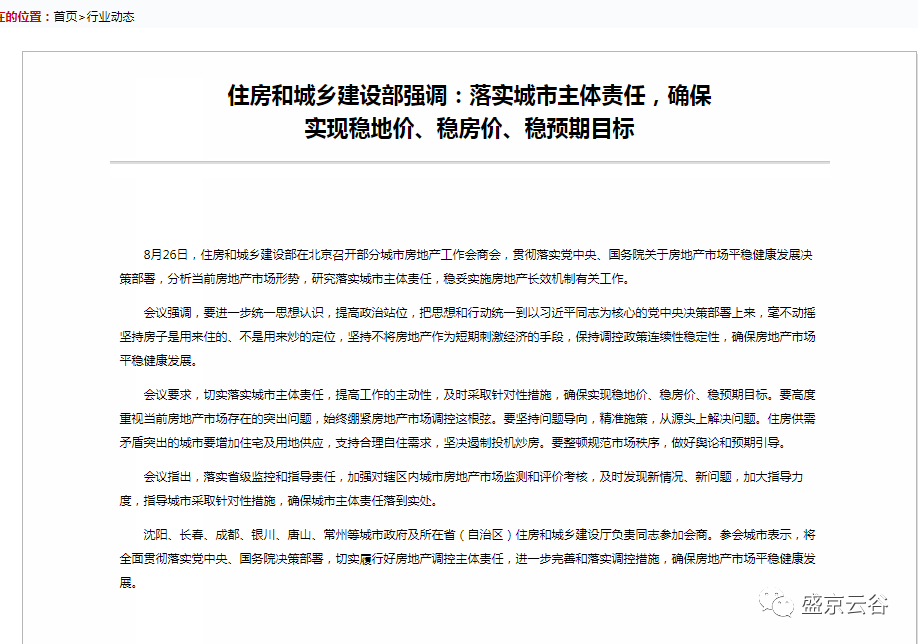 8月28日,中华人民共和国住房和城乡建设部(简称“住建部”)官方网站信息显示,8月26日,住建部在北京召开部分城市房地产工作会商会,强调要毫不动摇坚持“房子是用来住的、不是用来炒的”定位,确保实现稳地价、稳房价、稳预期目标。