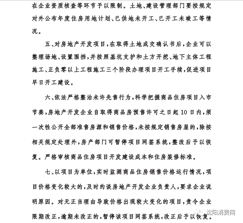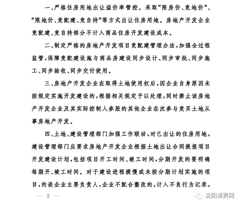 《通知》要求,严格住房用地出让溢价率管控。采取“限房价、竞地价”、“限地价、竞配建、竞自持”等方式出让住房用地。房地产开发企业竞配建、竞自持部分不计入商品住房开发建设成本。 《通知》提出,制定严格的房地产开发项目竞配建管理办法,加强全过程监管,保障竞配建设施与商品房建设同步设计、同步审批、同步施工、同步验收、同步交付使用。 《通知》明确,房地产开发企业在取得土地使用权后,因企业自身原因未按规定实施开发建设的,根据相关规定予以处理,同时禁止该房地产开发企业及其实际控制人参股的其他企业在沈参与竞买土地从事房地产开发。 《通知》要求,土地、建设管理部门加强工作联动,对已出让的住房用地,建设管理部门应要求房地产开发企业根据土地出让合同提报项目开发建设计划,包括项目开工时间、竣工时间,分期开发的要明确每期开、竣工时间。对于建设进程缓慢或未按分期计划实施的项目,约谈企业主要负责人,企业不配合整改的,计入不良行为记录,在企业资质核查等环节予以限制。土地、建设管理部门要按规定对外公布年度住房用地计划、已供地未开工、已开工未竣工等情况。 《通知》称,对房地产开发项目,在取得土地成交确认书后,企业可以整理场地、设置围挡,并按照基坑支护和土方开挖、地下主体工程施工、正负零以上工程施工三个阶段办理项目开工手续,促进项目早日开工建设。 《通知》要求,依法严格整治未许先售行为,科学把握商品住房项目入市节奏,房地产开发企业自取得商品房预售许可之日起10日内,须一次性公开全部准售房源和销售价格,未按规定销售房屋的,除按相关规定处理外,房产部门可暂停项目网签系统,整改后予以恢复。严格审核商品住房项目开发建设成本和住房装修标准。 《通知》提出,以项目为单位,实时监测商品住房销售价格运行情况,项目价格变化较大的,及时约谈房地产开发企业负责人,要求企业说明原因。对无正当理由导致价格出现较大变化的项目,责令企业限期改正,逾期未改正的,暂停该项目网签系统,改正后予以恢复。 《通知》明确,严格执行个人购买首套商品住房首付比例不低于30%规定,第二套商品住房首付比例提高到50%。首付款须一次性支付,禁止分期支付和“首付贷”。将个人住房转让增值税免征年限由2年调整到5年。 (来源:中国新闻网)