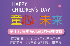 一、活动主题: 童心未来 第18届中兴儿童欢乐购物节 每个孩子都是一朵向阳花,迎着阳光,慢慢长大,绽放在蓝天白云下 二、活动时间: 2019 年5月31日6月2日 三、活动内容: 第一部分...