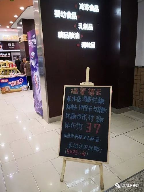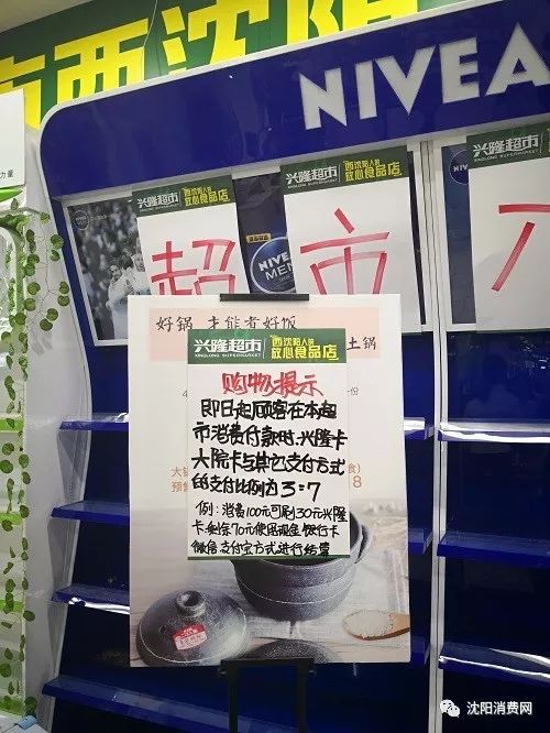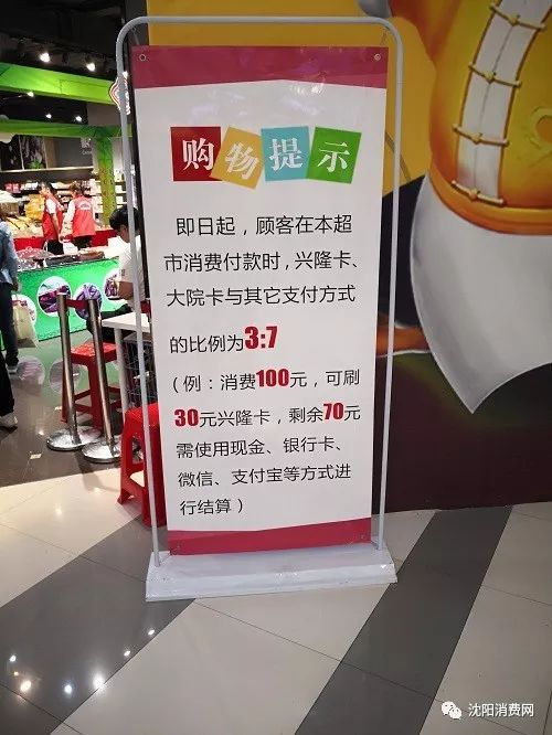 沈阳消费网网友爆料,近日发现除兴隆大奥莱超市3:7比例收银使用购物卡外,其他一些兴隆超市也按照3:7比例收卡。