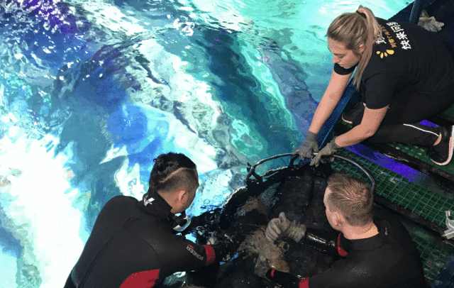 到达场馆后,水族师们通过专业操作让海洋生物逐渐适应新环境,避免它们因为进入新环境而导致的紧张和焦虑。