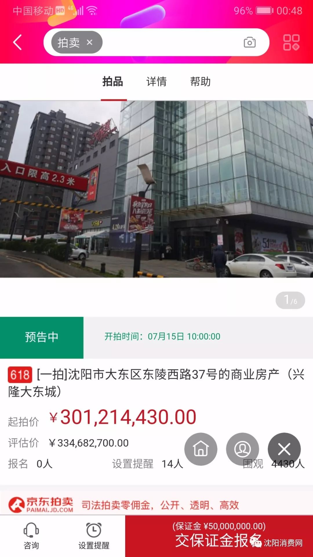 沈阳市中级人民法院将在京东网络司法拍卖平台上对兴隆大东城、肯德基汽车穿梭餐厅进行公开拍卖。拍卖时间为2019年7月15日10时至2019年7月16日10时止(延时的除外)。 信息显示,兴隆大东城位于沈阳市大东区东陵西路37号,建筑面积33830.25平方米,权证编号为“沈房权证中心字第N060298030号”,评估价为334682700元,起拍价为301214430元,保证金为5000万元,增价幅度为10万元。
