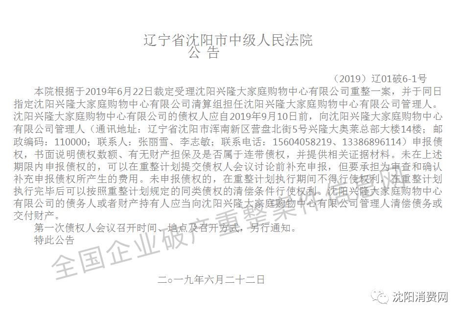 沈阳兴隆大家庭购物中心有限公司重整公告