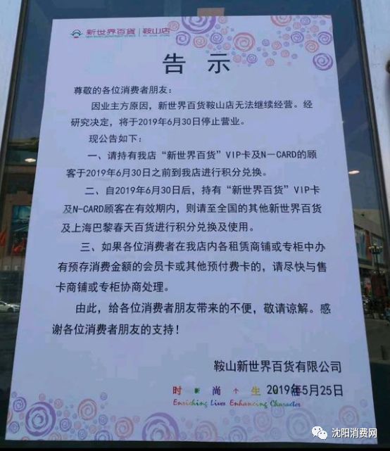 沈阳消费网网友爆料,鞍山新世界百货闭店,根据贴出的告示显示:因业主方原因,新世界百货鞍山店无法继续经营,于2019年5月30日停止营业。