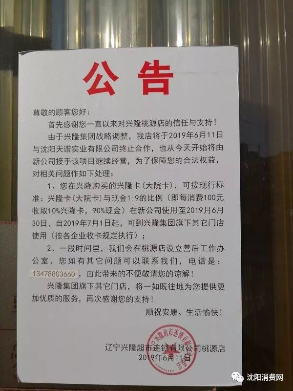 沈阳兴隆桃源店发出公告,由于兴隆集团战略调整,我店于2019年6月11日与对方终止合作。2019年7月1日起,本店不可再使用兴隆卡(大院卡)。