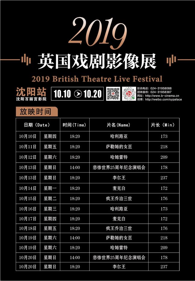 沈阳百丽宫英国戏剧影像展沈阳站10月10日开幕 ![]() 今年,戏剧影像展再度火热归来!我们将献上来自英国多个演出现场的7部优秀影像作品! 展映片单 ![]() 今年的片单中包括了“甘道夫”伊恩·麦克莱恩版《李尔王》,西区现场录制《悲惨世界25周年纪念演唱会》,凭借《神探夏洛克》、《神秘博士》等英剧大热的编剧、演员马克·加蒂斯主演的《疯王乔治三世》,国宝编剧阿兰·本奈特新作《哈利路亚!》,2018年英国国家剧院复排版《麦克白》,理查德·阿米蒂奇领衔主演的《萨勒姆的女巫》,当然,还有至今场场放映都异常火爆的本尼迪克特·康伯巴奇版《哈姆雷特》; ![]() 票 价 正价:120元 百老汇购票APP:100元 影城会员:80元