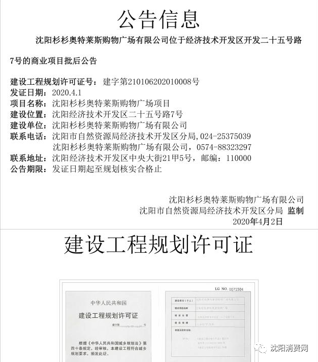 沈阳杉杉奥特莱斯购物广场有限公司位于经济技术开发区开发二十五号路7号的商业项目批后公告 建设工程规划许可证号:建字第210106202010008号 发证日期:2020.4.1 项目名称:沈阳杉杉奥特莱斯购物广场项目 建设位置:沈阳经济技术开发区二十五号路7号 建设单位:沈阳杉杉奥特莱斯购物广场有限公司 联系电话:沈阳市自然资源局经济技术开发区分局,024-25375039 沈阳杉杉奥特莱斯购物广场有限公司,0574-88323297 联系地址:沈阳市铁西区经济技术开发区中央大街21甲5号,邮编:110000 公告期限:发证日期起至规划核实合格止