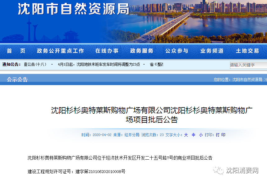 4月2日,沈阳市自然资源局经济技术开发区分局发布沈阳杉杉奥特莱斯购物广场有限公司位于经济技术开发区开发二十五号路7号的商业项目批后公告。