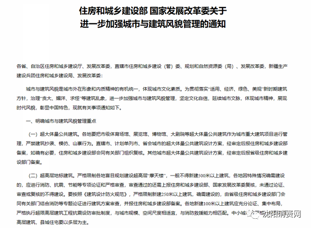 4月27日,住房和城乡建设部、国家发展改革委发布《关于进一步加强城市与建筑风貌管理的通知》(简称《通知》),其中指出,严格限制各地盲目规划建设超高层“摩天楼”,一般不得新建500米以上建筑;新建100米以上建筑应充分论证,严格执行相关审批制度。