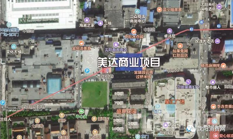 项目占据中街黄金位置,位于兴隆大家庭东侧,沈阳春天南侧,紧邻故宫、星汇广场。该项目停滞26年,目前已被盘活,围挡显示项目名称为沈阳美达国际名牌商场。