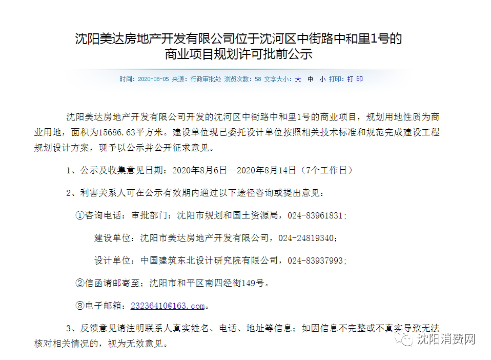 沈阳自然资源局近日公布了美达地产位于中街的商业项目规划许可批前公示: