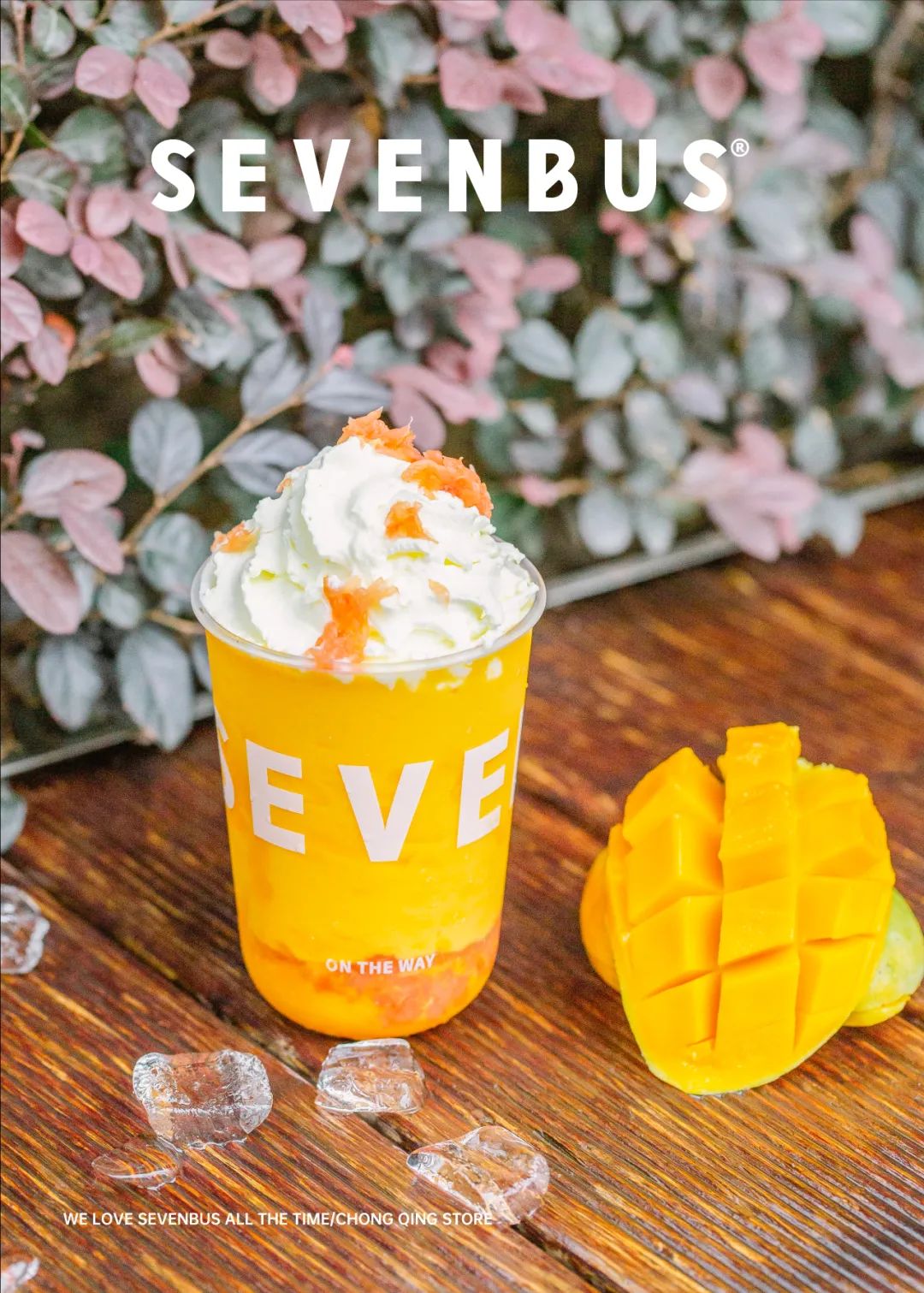 甘露芒果夏乐多 : 夏天和芒果似乎总是密不可分,年少时的情愫也常与夏日朦胧相伴。SEVENBUS用一杯甘露芒果夏乐多,带你回归香甜的夏日纯真。