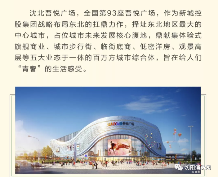 2021年9月,沈北吾悦广场将以约22万方的恢弘体量、12大主次力店, 270余个全业态品牌的完美组合,以全新的商业模式以及辐射百万人潮的地段优势,升级沈阳沈北区块的城市生活,缔造一个专属于沈阳,专属于沈北的新青年活力中心。 |
